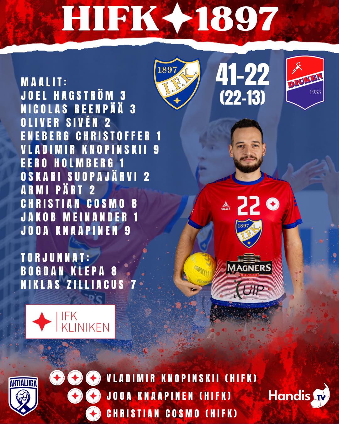 Tiistain derby-illassa HIFK rynnisti kentälle täydellä kiitolaukalla. Vielä sunnuntai-iltana BK-46:tta vastaan paininut Dicken ei saanut vauhtia päälle alkuminuuteilla, vaan HIFK painoi nopeasti ottelun neljä ensimmäistä maalia nollaten Dickenin kokonaan ensimmäisten viiden minuutin aikana. Punainen pyörremyrsky sai pikkuhiljaa vieraidenkin pelin paremmin hereille, ja Dicken sai muutamalla kavennuksella eron vain kahteen maaliin 5-3. Hieman väsyneen Cocks-pelin jälkeen IFK esiintyi huomattavasti paremmalla energialla, ja varsinkin puolustuspäässä Dickeniltä saatiin hienosti tila pois. Pakotetut virheet toivat IFK:lle runsaasti pallonriistoja ja avoimia vastahyökkäyksiä, joista erityisesti laiturit Knopinskii ja Knaapinen mättivät maaleja vuoron perään.