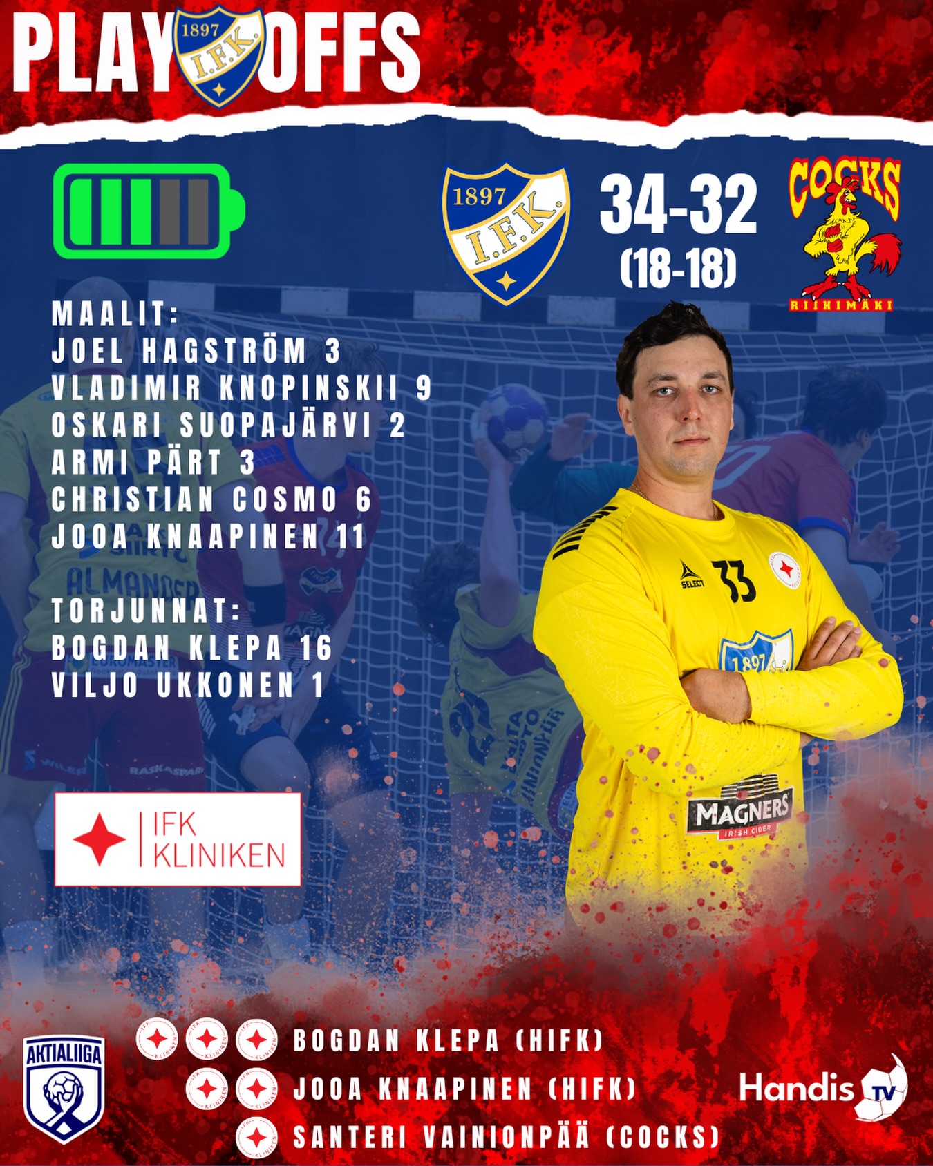 Toisen jakson alussa HIFK palasi kentälle tehokkaana. Vain kolmessa minuutissa ero nousi jälleen kolmeen maaliin 22-19. 40 minuutin kohdalla kukkovahti Benjamin Pedersen nappasi kaikki IFK-yritykset pois ja Röda jäi ilman pelitilannemaalia 9 minuutin ajaksi. Cocks nousi jo rinnalle 24-24, mutta Teemu Tammisen ensimmäinen ulosajo tarjosi IFK:lle ylivoimatilanteen. Cocksin miesvajaus kasvoi jo kahteen, kun Niko Hållman tuomittiin samanaikaisesti jäähylle keskialoituksen häirinnästä. Ulosajojen aikana HIFK nosti eron kahteen maaliin 27-25. Täysilukuinen Cocks sai vielä kolmannen peräkkäisen jäähyn vaihtovirheestä, ja IFK osui jälleen kahdesti päästen jo 29-25 johtoon viimeisen 10-minuuttisen alkaessa. Cocksin tiimalasi alkoi käydä vähiin, ja riihimäkeläiset taistelivat ansiokkaasti kautensa jatkamiseksi. HIFK onnistui kuitenkin kuittaamaan kaikki vierasmaalit, ja ero pysyi kolmessa (32-29) 55 minuuttiin asti. Jo toisessa pelissä voiton varmistanut Bogdan Klepa oli varmana tämänkin ottelun lopussa, ja 16 torjuntaa piti Cocksin turvallisen välimatkan päässä loppuhetkillä. Matsin helpottavin maali nähtiin ajassa 58:53, kun Suopajärvi täräytti IFK:n kolmen maalin johtoon 34-31. Matsin viimeisellä minuutilla Cocks ehti kaventaa vain yhdellä maalilla ja HIFK pääsi tuulettamaan viikon kolmatta voittoaan.