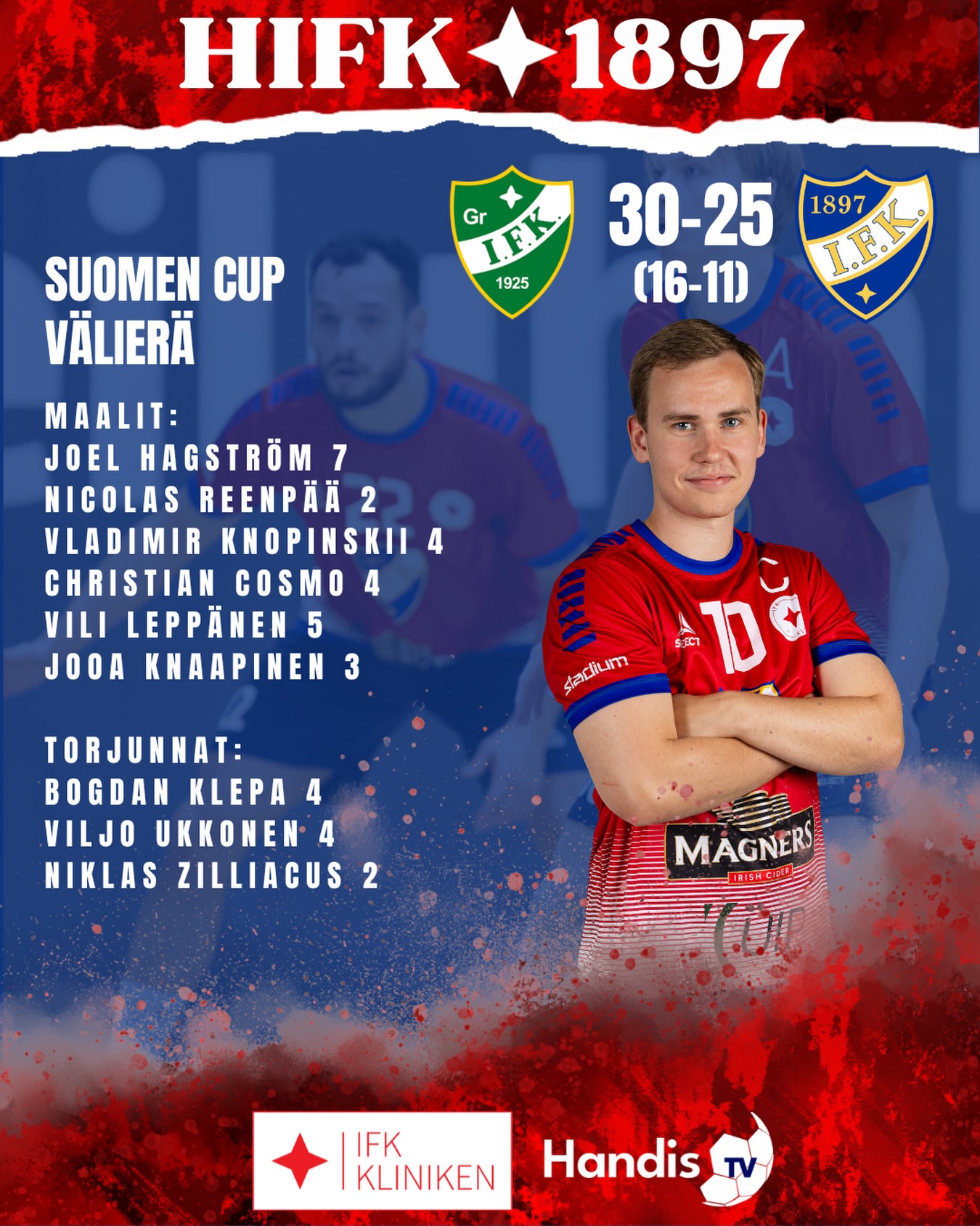 Valkoisissa pelannut Röda sai eron alle kolmeen maaliin vasta 52 minutin kohdalla Nicolas Reenpään 24-22 kavennuksella. Kiriä vaikeutti Armi Pärtin ulosajo, mutta HIFK pääsi vajaallakin vain yhden maalin päähän kun peliaikaa oli jäljellä alle 7 minuuttia. Homma sujui turhan hyvin HIFK:n kannalta, joten myös Reenpäälle tuomittiin 2 min ulosajo samanaikaisesti Pärtin kanssa. Ja vielä Reenpään jäähyn perään HIFK:n maalivahti Bogdan Klepa lähetettiin istumaan erikoisesta tilanteesta torjuntaliikkeen päätteeksi. Reilut 52 minuuttia ilman rangaistuksia selvinnyt HIFK keräsi viimeisen 8-minuuttisen aikana 6 minuuttia alivoimaa. Kolme peräkkäistä ulosajoa antoi ratkaisun avaimet Granille, ja toisella jaksolla hieman jalkojaan laahannut isäntäjoukkue spurttasi loppuhetkillä viiden maalin voittoon. Näin ollen GrIFK aiheutti jo toista kertaa syksyn pimeydessä HIFK:lle vierastappion, jättäen stadilaiset Kauniaisten ainoalle metroasemalle odottamaan Cup-junaa finaaliin, joka ei ainakaan tänä vuonna ota punaisia kyytiin. Kaavion mukaisesti GrIFK saa isännöidä Cupin loppuottelun kotikentällään, vastustaja ratkeaa ensi tiistain toisessa välierässä Cocks-BK-46.
