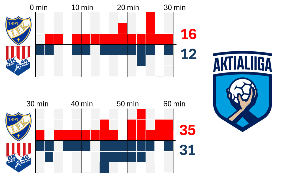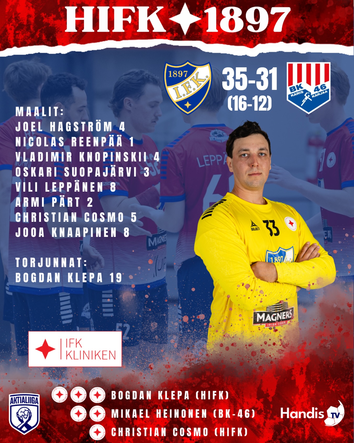 35-31 kotivoitolla HIFK sai kaadettua viimeisenkin kuusen metsänreunasta, ja BK-46 liukastui ensimmäistä kertaa ojaan voittojen polultaan. Kumpikin joukkue esitti parastaan, ja tällä kertaa IFK:n kurinalaisuus riitti koko matsin ajan. Vahva yhteispeli ei antanut BK:lle lainkaan helppoja maaleja, kun punainen seinämä suojeli omaa maalia tiukasti keskittyneenä. Arvokas kotivoitto tarkoitti että IFK on avannut jokaisen paketin vaatekomerosta, kun kaikki liigavastustajat ovat vuorollaan käyneet häviämässä UT:n voittamattomalla kotikentällä. Vuoteen 2025 mahtuu vielä yksi kotipeli, kun ensi perjantaina HIFK kohtaa tässä vaiheessa kauden pahimman vastuksen Grankulla IFK:n. GrIFK on aiheuttanut HIFK:lle jo kaksi tappiota Kauniaisissa, kun liigamatsin lisäksi HIFK hävisi Suomen Cupin välierässä kallion alla. Ensimmäisen kierroksen kohtaaminen Aktialiigassa päättyi HIFK:n tyrmäävään 44-25 kotivoittoon.