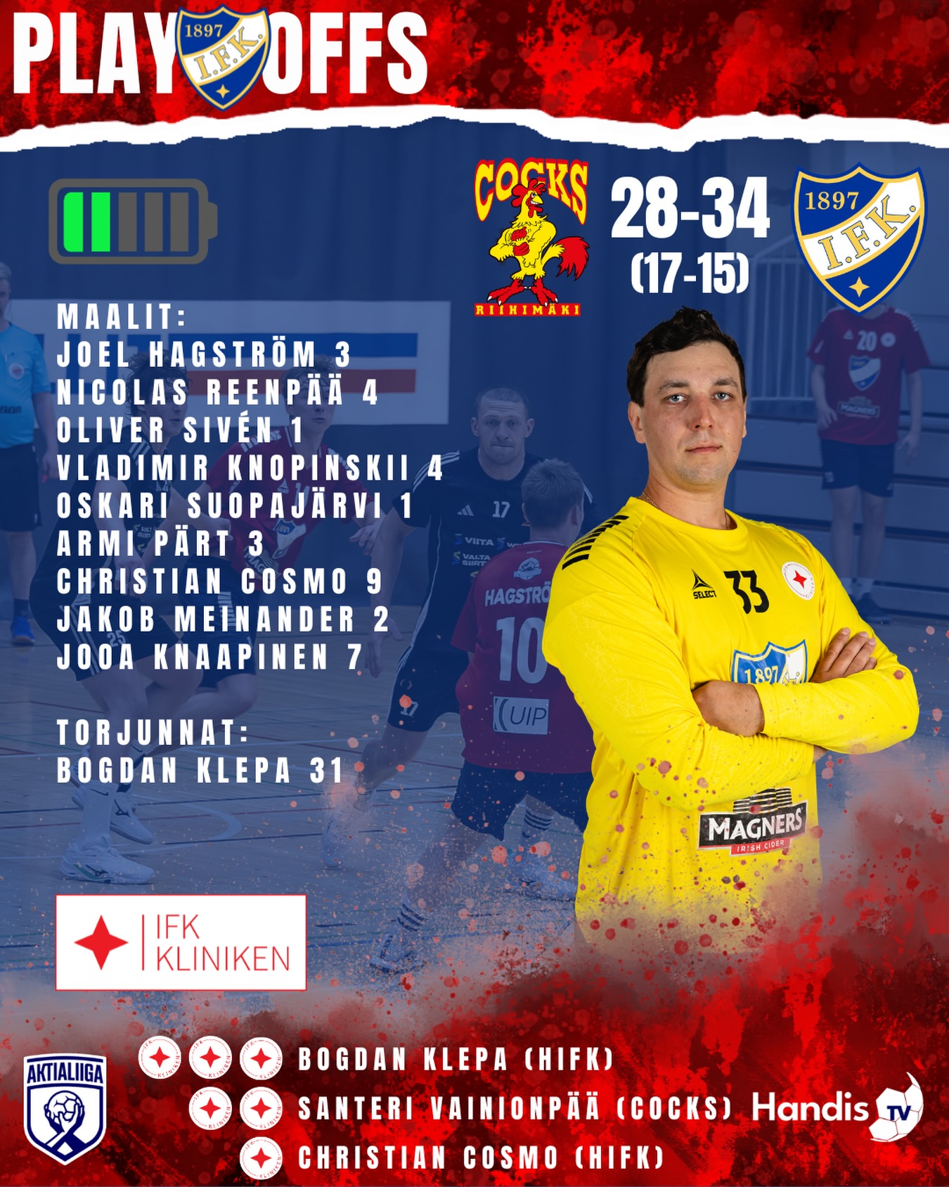 Kahden voiton jälkeen HIFK on kerännyt käsiinsä kolme ottelupalloa sarjan katkaisemiseksi. Voittamalla yhdenkin ottelun jäljellä olevista kolmesta pelistä, esiintyy HIFK käsipallon SM-finaaleissa ensimmäistä kertaa vuoden 1989 jälkeen. Riihimäellä peliä auttoi punaisen vieraskatsomon äänekäs kannustus, kannattajien tukea tarvitaan myös kotihallissa mihin todellakin mahtuu lisää yleisöä todistamaan IFK:n parasta pelikuntoa koko 2000-luvulla. Finaalipaikka on ensimmäistä kertaa tarjolla tiistain kolmannessa välierässä, peli alkaa Kalliossa klo 19:30. Tule ajoissa paikalle ettei lipunmyynti ruuhkaudu juuri ennen ottelun alkua!