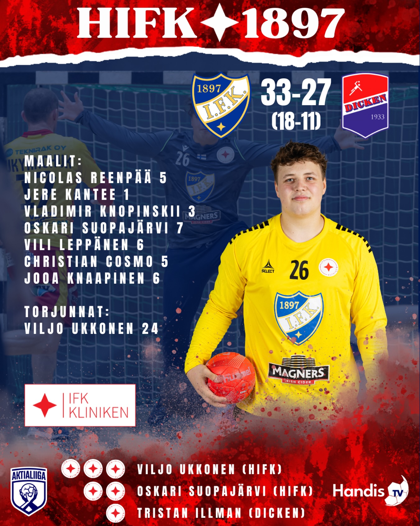 HIFK menetti tärkeän osan hyökkäyskuvioistaan, kun 6 maalia viimeistellyt Vili Leppänen lähetettiin katsomon puolelle 44 minuutin kohdalla. Tilanteen ulkopuolelta tullut kontakti osui Dickenin kasvoihin, ja nopean arvioinnin jälkeen tuomaristo nosti suoraan punaisen kortin. Rankkari pysähtyi tietenkin Ukkosen torjuntaan, joka otti kiinni 7 yritystä Dickenin koko pelin 10 rankkarista. Leppäsen puuttuminen hyökkäyksistä ei aiheuttanut suurta katastrofia, vaan Oskari Suopajärvi pisti palloa verkkoon vasemmalta puolelta. Vastuu jakautui tasaisesti ympäri kentän, kun viisi eri IFK-pelaajaa eri paikoilta teki vähintään viisi maalia. Dickenin riveissä ainoastaan Tristan Illman ja Carlo Granfors ylsivät yli kolmeen häkkiin. Perjantain ottelussa rankkarit eivät tuoneet merkittävää etua rikotuille joukkueille. HIFK onnistui vain kahdesti kuudesta 7m-heitostaan, ja Viljo Ukkonen pysäytti törkeät 7 heittoa Dickenin 10 yrityksestä. Vieraiden puolustus puristi IFK:n koko syyskauden vähämaalisimpaan puoliaikaan – toisella jaksolla HIFK sai viimeisteltyä vain 15 maalia Dickenin osuessa 16 kertaa. Ensimmäisen jakson suoritukset riittivät kuitenkin lopulta kuuden maalin voittoon, ja HIFK sai kirjata liigatilastoihin kuudennen peräkkäisen voittonsa.