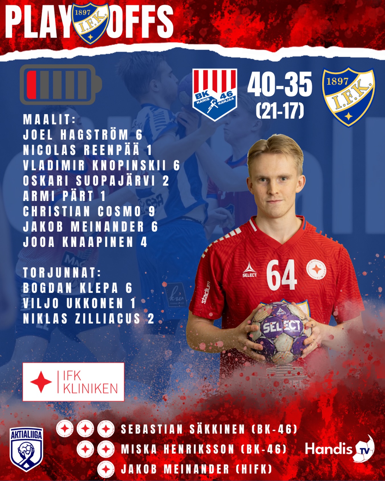 Maalinteossa juuri BK:n pelätyimmät aseet onnistuivat parhaiten. Laidasta Sebastian Säkkinen viimeisteli neljän rankkarin kanssa yhteensä 11 maalia, ja pakkina pelannut Miska Henriksson iski 9 osumaa. HIFK:n nälkäisin pelaaja oli Christian Cosmo 9 maalilla, ja Hagström, Knopinskii sekä Meinander tukivat jokainen kuudella maalilla. 35 tehtyä maalia vieraskentällä finaalissa oli hyvä onnistuminen, mutta 40 päästetyllä ei voi haaveilla pelien voittamisesta. Kotihallissa keskiviikkona tarvitaan lisää tsemppiä ja kurinalaisuutta puolustuspeliin, mutta ison osan avauspelistä HIFK pystyi antamaan täysin tasavertaista vastusta kokeneemmalle finaalijoukkue BK:lle.