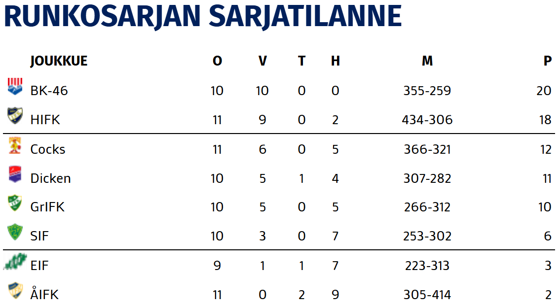 HIFK:n voittoputki katkesi lopulta kuuden peräkkäisen voiton jälkeen kauden ensimmäiseen tappioon BK-46:n vieraana Karjaalla. Marraskuun alussa HIFK kärsi toisenkin pistemenetyksen Granissa, mutta kotihallissa on tähän asti tullut pelkkiä voittoja. Viiden peräkkäisen kotivoiton jälkeen kovimmat haasteet ovat nyt edessä, kun Cocksin perään seuraavana vieraana Kalliossa nähdään sarjaykkönen BK-46.