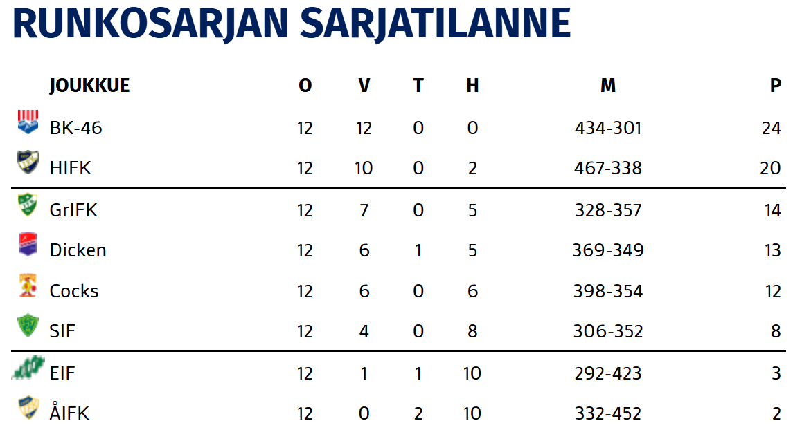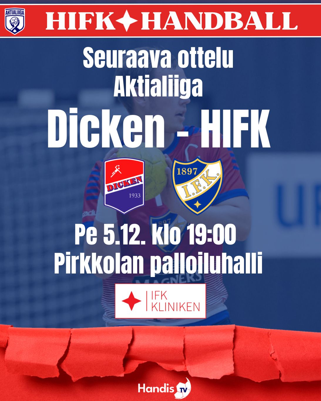 Kaikilla joukkueilla sarjassa on tässä vaiheessa 12 ottelua takanaan, ja HIFK on kerännyt matseistaan 10 voittoa sekä pyöreät 20 sarjapistettä. Dickenin saaliina on yhden tasurin lisäksi 6 voittoa, joista kolme on tullut viimeisten viiden matsin aikana. Dickenin 13 pistettä riittää neljännelle paikalle vain pisteellä Grankullan takana. Syksyn ensimmäinen derby-matsi Kalliossa päättyi HIFK:n kuuden maalin voittoon 33-27, vaikka Röda sai vahvan otteen voitosta jo ensimmäisellä puoliajalla (18-11).