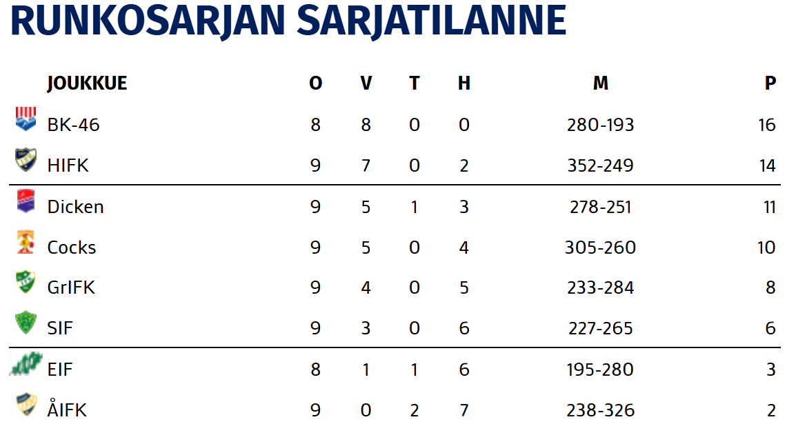 Valmentajanvaihdos ei ole ainakaan välittömästi muuttanut tuloksia paremmaksi. Savukynas on ehtinyt ohjata kolme ottelua lokakuun lopun jälkeen, mutta SIF kärsi tappiot kaikissa peleissä Cocksille, Dickenille ja BK-46:lle. Koko kaudella SIF on voittanut vasta kolme ottelua, ja kuudella pisteellä Sjundeå roikkuu keskiryhmän viimeisenä sijalla kuusi.