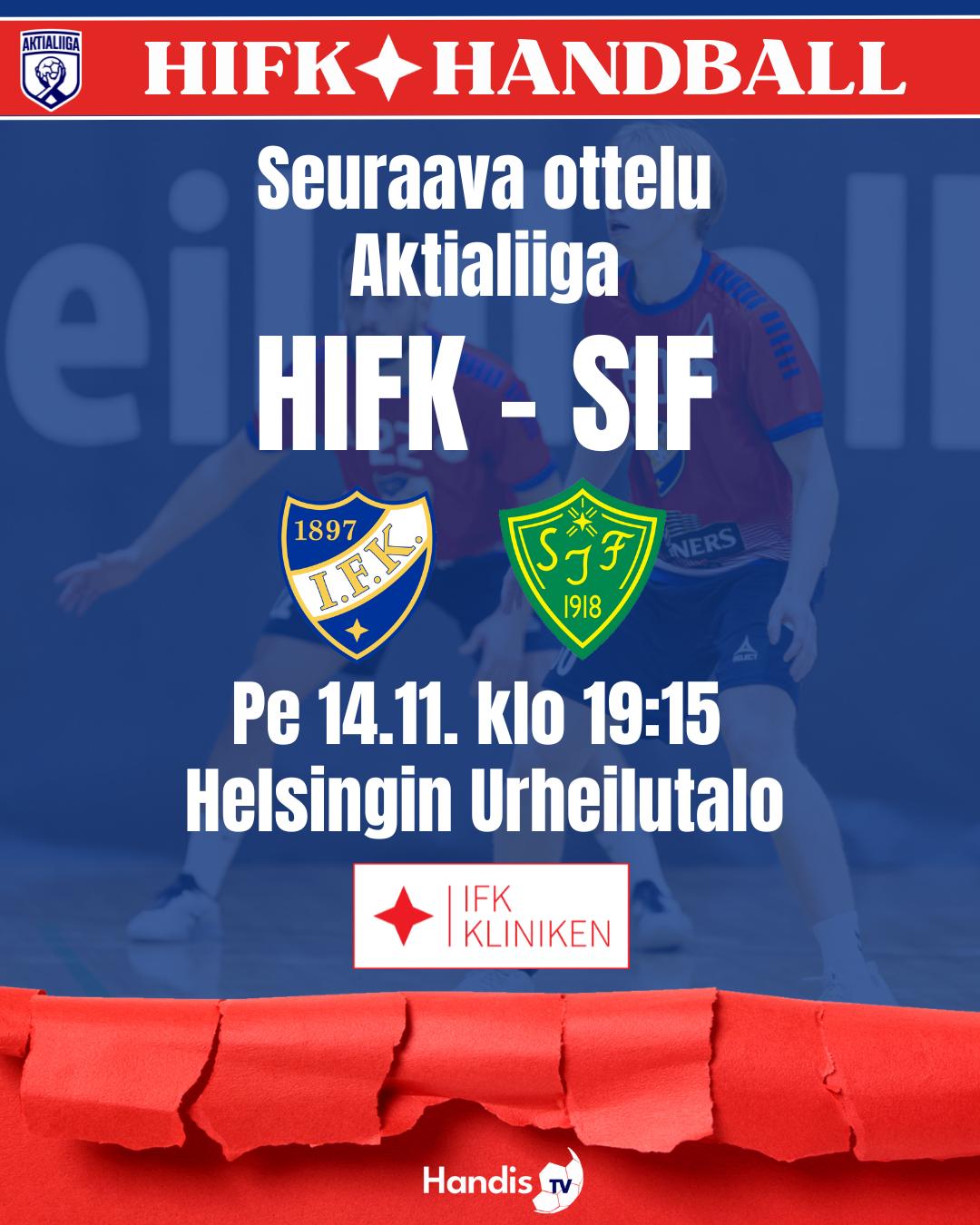 Perjantaina HIFK palaa kotiparketille aloittamaan uutta voittoputkea. Röda on syksyn aikana kärsinyt jo kaksi tappiota vieraissa, kun BK-46 piti kotihallinsa voittamattomana ja viime viikonloppuna myös Grankulla IFK onnistui yllättämään stadilaiset maalein 37-35. Kotikentällä on tähän mennessä nähty pelkkiä voittoja, ja seuraavaksi haastajaksi saapuu Sjundeå IF. Kesän siirtomarkkinoilla SIF teki runsaasti vahvoja liikkeitä, ja joukkueeseen kasattiin merkittävä määrä uutta voimaa kuten IFK-paidasta siirtynyt Viktor Grönmark. Alkukauden tulokset eivät yltäneet joukkueen haluamalle tasolle, ja viimeisin muutos nähtiin valmennuksessa kun SIF-penkille saapui kokenut liettualaisvalmentaja Gintaras Savukynas.
