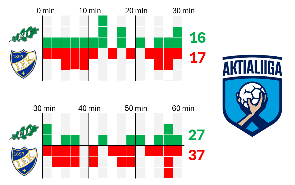 Joulukuun talvisia maisemia päästiin taas katsomaan Jalo-bussin ikkunasta. Lumipeite oli yhtä olematon Tammisaaressakin, ja HIFK joutui laahustamaan kentälle allapäin. Yhdeksännellä minuutilla IFK oli maalin johdossa tilanteessa 5-6, kunnes muutaman pallonriiston jälkeen Röda sai eron kasvamaan 3 maaliin 6-9. EIF:n aikalisä kuitenkin nosti energiatasoja isäntäjoukkueella, ja yhtä nopeasti vihreät tammenlehdet iskivät kolme peräkkäistä maalia ja peli oli taas tasan 9-9. Vartin jälkeen Ekenäs nousi jo maalilla IFK:n edelle, mutta jakson loppupuoliskolla maaleja tehtiin lähes vuorotellen ilman suurempia karkumatkoja. Christian Cosmo iski muutaman maalin viime minuuteilla ja IFK pääsi hetkeksi kahden maalin johtoon ennen Noah Hagmanin kavennusta juuri ennen taukosummeria.