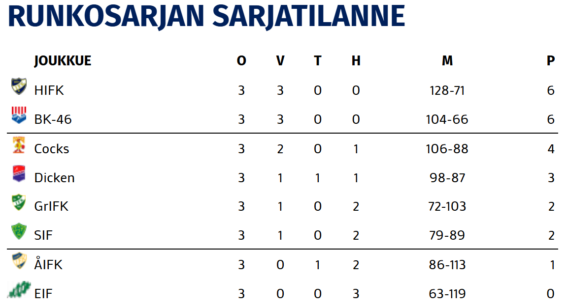 HIFK aloitti Aktialiigan puhtaalla kolmen ottelun voittoputkella. Liiganousija Ekenäs IF jäi tylysti jalkoihin 21 maalin erolla 18-39, mutta tahti on hiukan hidastunut ja Grankulla IFK:ta vastaan ero oli 19 maalia (44-25) ja viimeksi Åbo IFK:ta vastaan enää 17 maalia (45-28). Kuudella sarjapisteellä HIFK jakaa Aktialiigan ykköspaikan toisen tappiottoman joukkueen BK-46 kanssa, mutta Rödan maaliero +57 pitää IFK:n ykkösenä. HIFK:n maalikunkkuna on viime kauden tapaan Jooa Knaapinen, joka tässä vaiheessa johtaa koko liigan tilastoja 28 maalilla. 10 parhaan joukkoon mahtuu IFK:sta myös Vili Leppänen (22 maalia) ja Christian Cosmo (21 maalia).